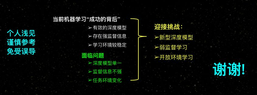 所以下一步,机器学习的研究或者应用特别要关注研究新型深度模型、弱监督学习以及开放环境的学习。