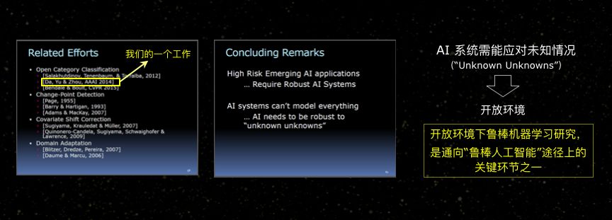 他提出未来的人工智能系统需要能够应对未知情况,他给了一个说法,叫做“Unknown Unknowns”,指的就是开放环境。开放环境下机器学习研究是通往鲁棒人工智能的非常重要的环节。