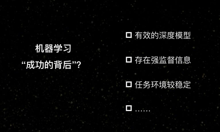 总结一下,现在机器学习成功的背后主要有三个原因,有效的深度模型,存在强监督信息以及学习环境比较稳定。但是,现实应用里面这三件事情都不成立,有的场合可能还没有很适合的深度学习模型,监督信息也不够强,任务环境不断变化等等。