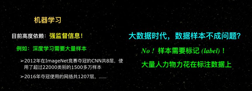 样本需要标记,我们现在大量的人力物力都花在这件事上,比如前段时间有讨论人工智能会不会使得一些职业消亡。是不是消亡我们没看到,但是我们已经看到一个新的职业,就是数据标注已经变成一个产业。这件事情不管它好还是不好,反正它就在那儿,至少告诉我们机器学习技术现在对强监督信息是高度依赖的。