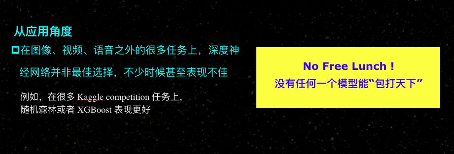 周志华教授说,机器学习界早就很清楚,“没有免费的午餐”,也即任何一个模型可能只适用于一部分的任务,而另外一些任务是不适用的。例如,Kaggle竞赛中有各种各样的任务,但在图像、视频、语音之外的很多任务上,比如订机票、订旅馆之类,还是传统机器学习技术(如随机森林或XGBoost)表现更好,尤其是涉及符号建模、离散建模、混合建模等问题。