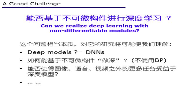 这个问题如果得到答案,我们可以得到一系列其它问题的答案,比如深度模型是不是只能用深度神经网络来做?我们有没有可能不通过BP算法来做出这种深度模型?我们能不能在图像、视频、语音之外的任务也能够获得一些深度模型,帮助我们获得更好的性能?