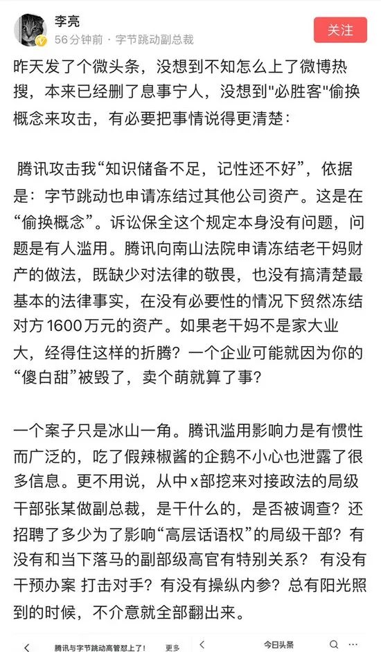 近日,腾讯与老干妈广告乌龙事件闹得沸沸扬扬。7 月 1 日晚上,字节跳动副总裁在其个人头条号上吐槽腾讯:“基础事实都没调查清楚,就可以直接启用公检法手段,竟然还成功冻结了对方1600万元!说明这家公司已经形成了用公检法打击一切不利于它的日常思维,而且简化到连调查都懒的去调查了。”