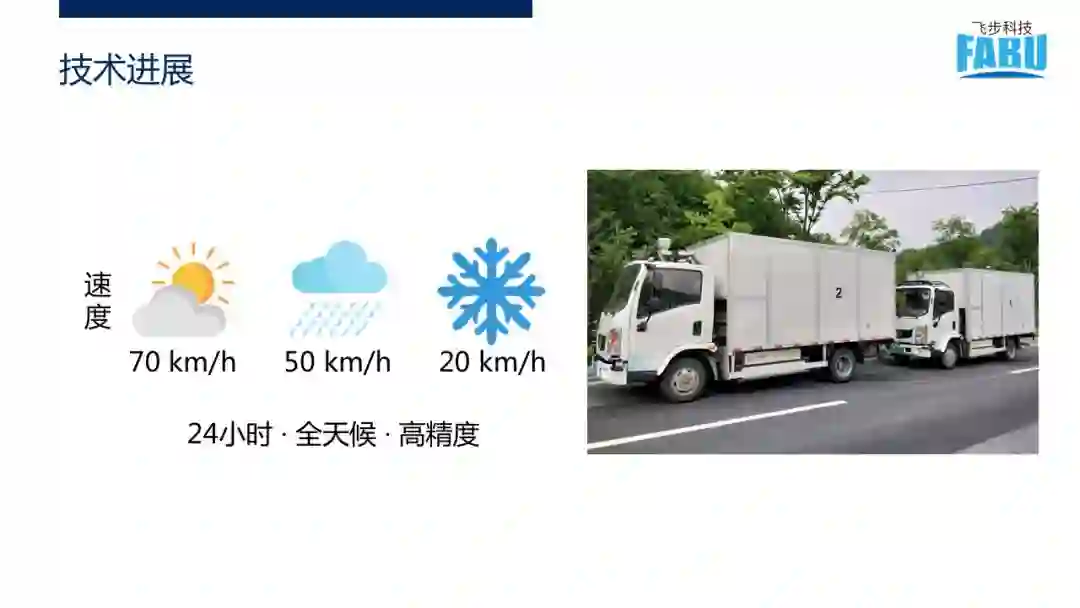 何晓飞还透露了团队在无人驾驶上的一个重大技术进展,飞步科技无人驾驶卡车可以全天24小时行驶,甚至在雨雪天气也能上路行驶。何晓飞表示,飞步无人卡车在晴天速度可以达到70km/h,雨天速度可以达到50km/h,雪天的速度可以达到20km/h。