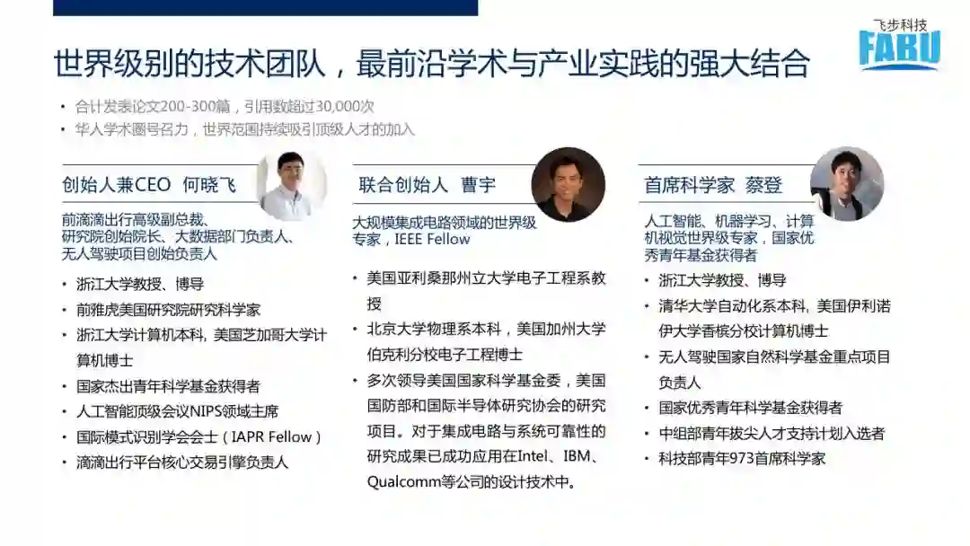 飞步科技的另一位联合创始人为曹宇。曹宇是大规模集成电路领域的世界级专家,IEEE Fellow。多次领导美国国家科学基金委,美国国防部和国际半导体研究协会的研究项目。