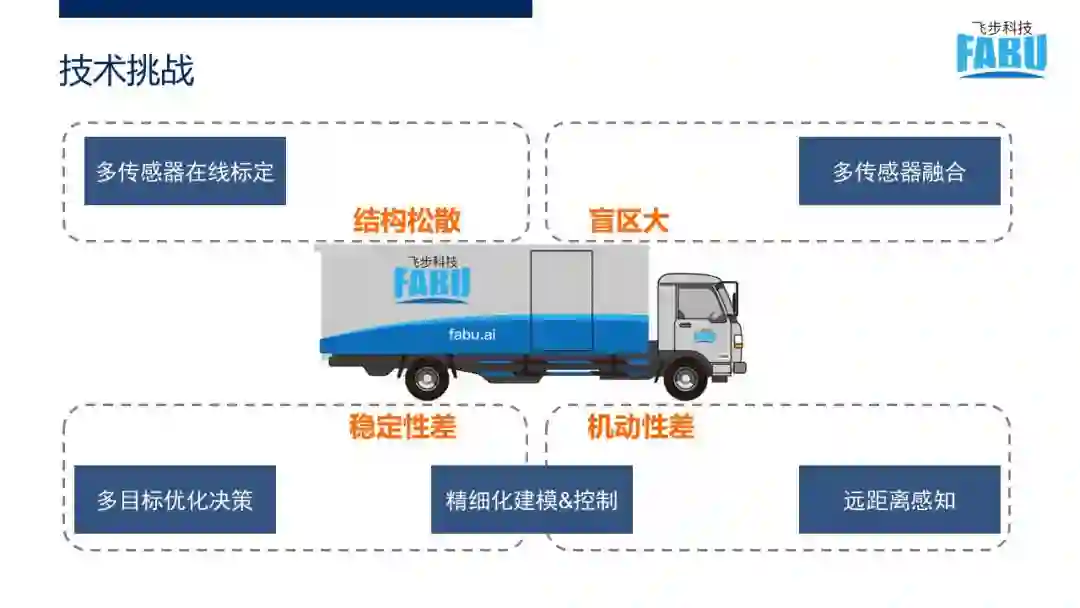 第二个挑战是盲区大,货车车厢非常大,会遮挡激光雷达,所以要利用多传感器融合技术。