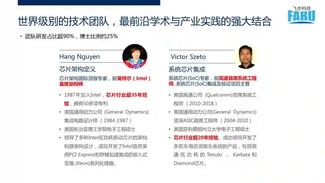 前英特尔首席架构师Hang Nguyen负责飞步科技芯片架构定义,她是芯片架构国际顶级专家,在芯片行业有超过35年的经验。而系统芯片专家Victor Szeto负责飞步的系统芯片集成,他负责飞步科技的系统芯片集成,曾是高通首席系统工程师、系统芯片集成及验证项目主管。
