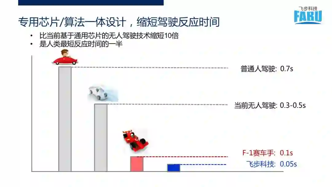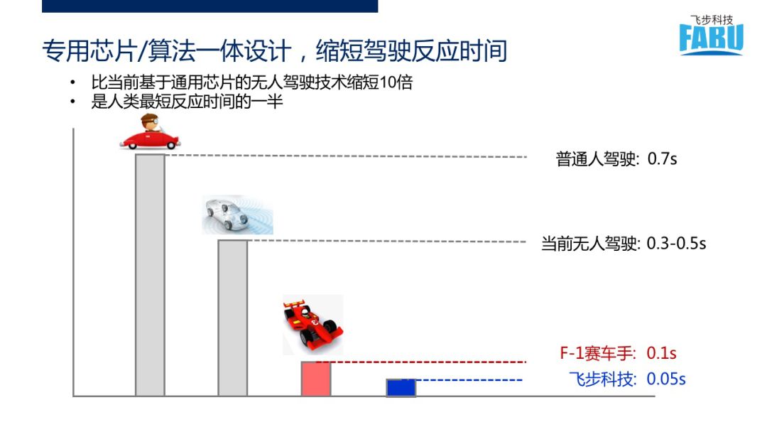 何晓飞特别提到,做无人卡车驾驶光是从算法上优化远远不够,还要专用芯片,缩短驾驶反应时间。“普通人驾驶的反应速度是0.7秒,当前无人驾驶的反应时间大概达到0.3-0.5秒,F-1赛车手的反应时间是0.1秒,飞步科技软硬件结合一体设计反应时间可以达到0.05秒,比基于通用芯片的无人驾驶技术缩短10倍。”何晓飞说到。