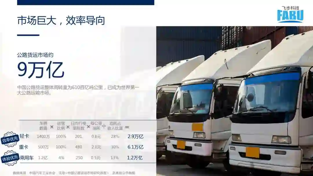关于为何切入无人驾驶货车市场,何晓飞表示,中国货运市场十分庞大,约占到GDP的10%,仅中国公路货运市场就达到约9万亿元。“切入无人驾驶,是看到未来比乘用车市场更大的潜力。”