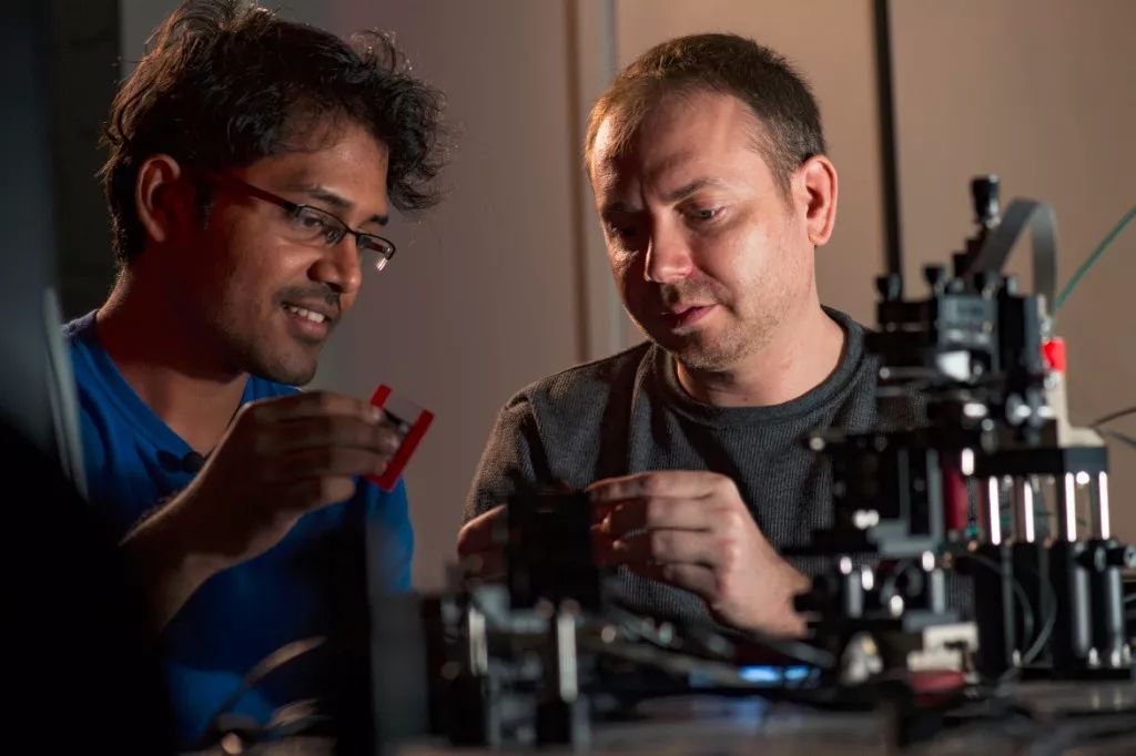 下图是莱斯大学的研究生Vivek Boominathan(左)和Jesse Adams正在搭建平面显微镜的实验。这款无透镜的平面摄像头可作为荧光显微镜,它能用于捕捉三维数据,并从视场中任何地方的物体构建图像。
