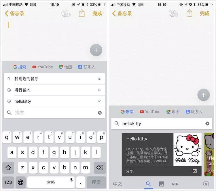 除了准确率很高的滑动输入,Gboard 上面还集成了很多 Google 的技术。最独特的就是加入了 Google 搜索按钮,直接输入文字可以翻译、输入关键词可以搜索,还可以查看天气、地点等信息。如果你愿意花费一些精力来搞定 Google 服务,Gboard 是个不错的选择。