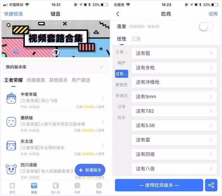 66 键盘的基本原理和 Lazy K 相似,都是把快捷短语和自动回车结合,但更「暴力」的是,66 键盘中还提供了一大批怼人的「弹药」,并增加了连发模式。版本库里有很多种键盘版本,《王者荣耀》、戏精套路、过年红包、花样怼人,每种键盘里预设了常用的词句,直接添加就能使用。如果打开连发模式,你只需要点击一下,所有语句就会连续发送,比自动回车更「恐怖」。