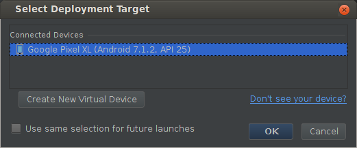 请确保您的 Android 设备连接到了开发机,并在 Android Studio 中点击 “运行”。随后,选中您的设备作为部署目标,并点击 “OK”。