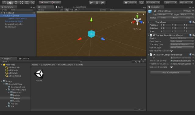在项目窗口中通过 Assets > GoogleARCore > HelloARExample > Scenes 选中场景。