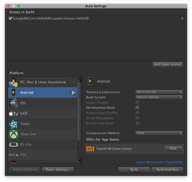 Scenes in Build 列出了您的项目中有哪些场景会被包含在您的构建中。按照下面的方法即可从 HelloAR 示例应用中添加场景到您的构建中:
