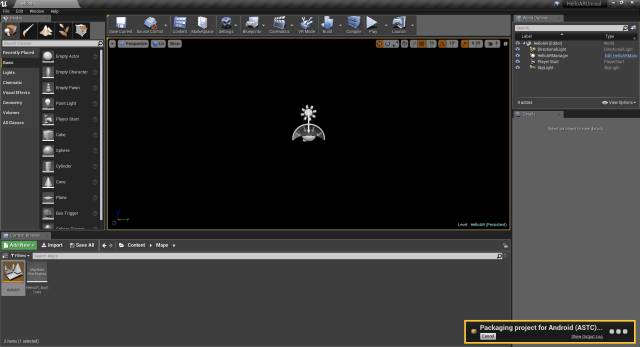 Unreal 开始打包项目,并在状态窗口(位于右下角)中显示进程。想要详细了解打包进程,参见 Output Log 窗口。