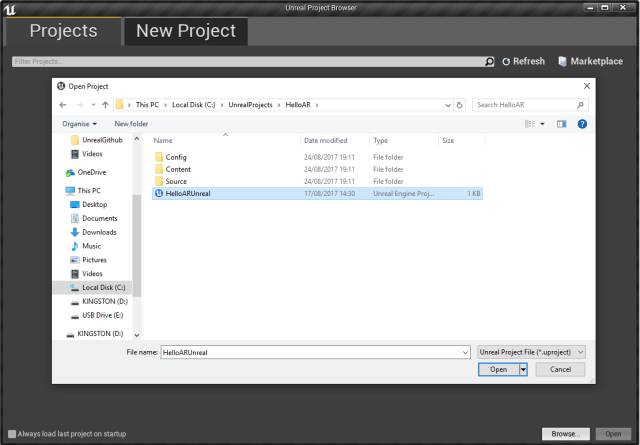 项目打包完成后,请确保您的设备仍连接着电脑。打开 Builds 文件夹,双击文件 Install_HelloARUnreal_Development-armv7-es2.bat (Windows 用户)或 Install_HelloARUnreal_Development-armv7-es2.command (Mac 用户),在您的 Android 智能手机上安装项目。