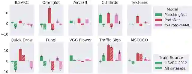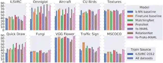 在 Meta-Dataset 中,除了上述小样本学习中固有的难以泛化至新类的问题,我们还研究了训练成果至全新的数据集的泛化(训练中未使用任何类的图像)。