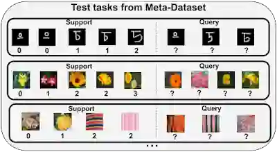 Meta-Dataset 的测试任务:与上文展示的 mini-ImageNet 任务相反,此处的各种任务来自不同的数据集(的测试类)。此外,各任务之间的类数量和支持集大小可能不同,支持集中可能存在类不均衡的问题