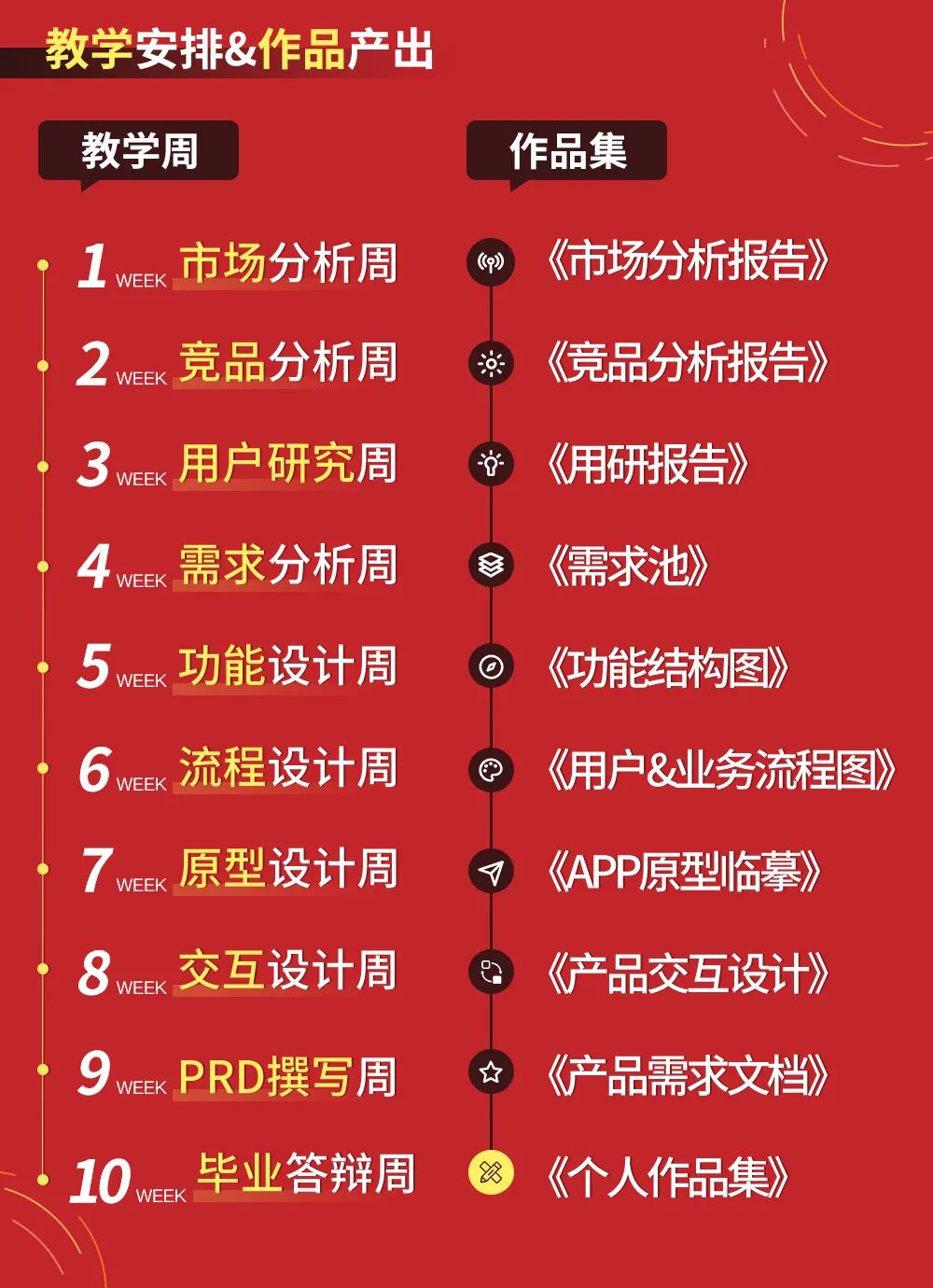 与产出作品相匹配的,是为你量身定制的“10周线上陪伴式教学模式”,所学内容源自BAT产品培养体系和市场上企业的招聘需求,每一周你都会通过“大量刻意练习+输出倒逼输入”掌握一个产品模块的方法论,10周后你就能达到或超过不同企业的招聘标准。