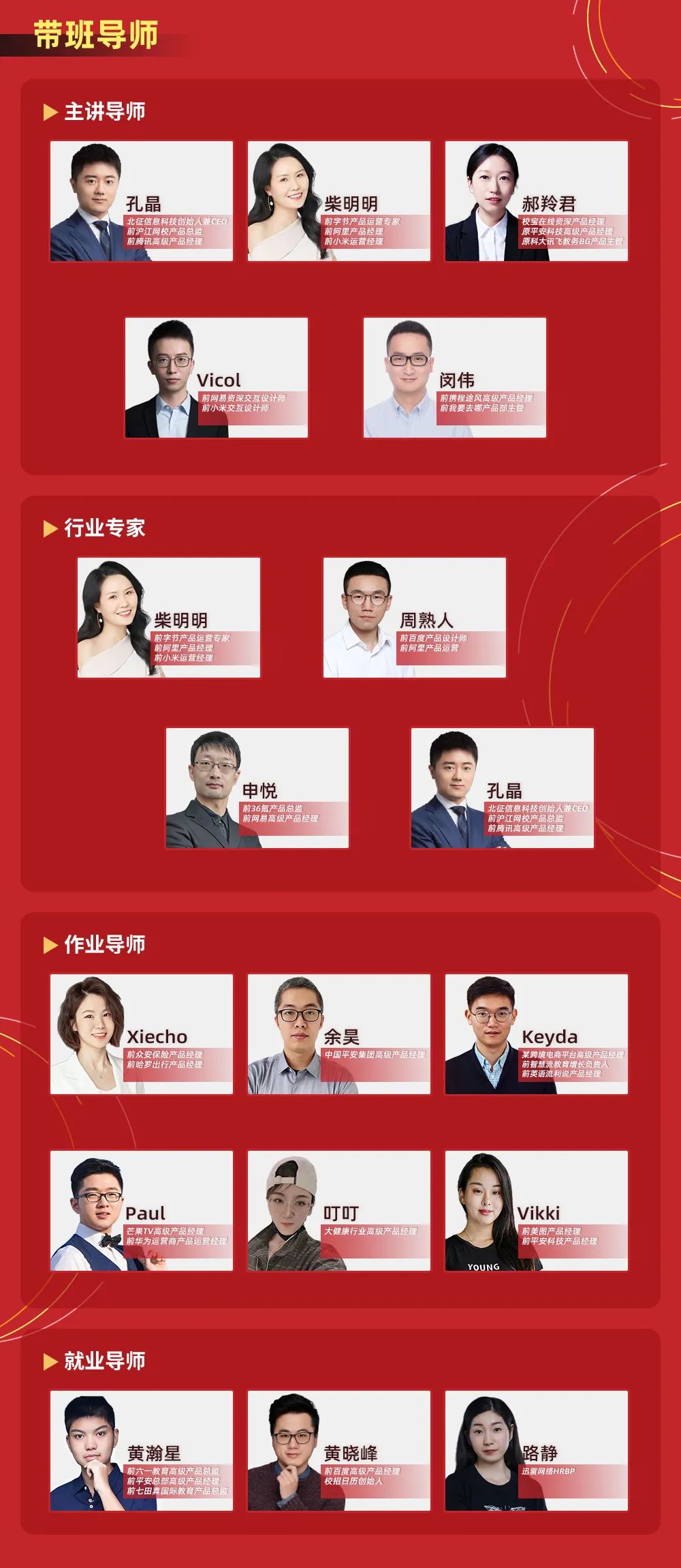 最终是否能达成目标,靠的不仅仅是教学内容本身,还需要资历深厚的一线互联网产品导师来保障你的“教·练·做”,导师们会为你带来比其他课程更多、更优质的教学服务——通过200+录播课、N次社群聊一聊、20+直播课、9次作业答疑、4次方向指导、3次1V1咨询等服务,将成熟的思维&方法论深入浅出地传授给你。