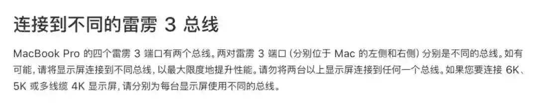 MacBook Pro 的四个雷雳 3 端口有两个总线。两对雷雳 3 端口(分别位于 Mac 的左侧和右侧)分别是不同的总线。如有可能,请将显示屏连接到不同总线,以最大限度地提升性能。请勿将两台以上显示屏连接到任何一个总线。如果您要连接 6K、5K 或多线缆 4K 显示屏,请分别为每台显示屏使用不同的总线。