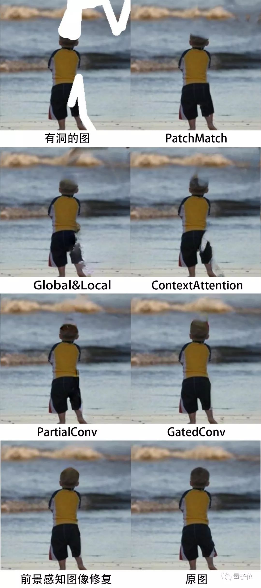 而头顶的部分,前景感知图像修复算法是唯一一个把头顶修复清晰的,虽然小男孩看起来年纪轻轻,发际线不低,但整张图片都是完整清晰的。