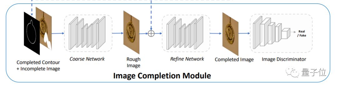 轮廓补全模块的架构,与现有的图像修复技术的架构类似,是一个基于GAN的模型,由生成器和PatchGAN判别器组成。生成器包括两个网络,一个是粗略网络,一个是精细网络。