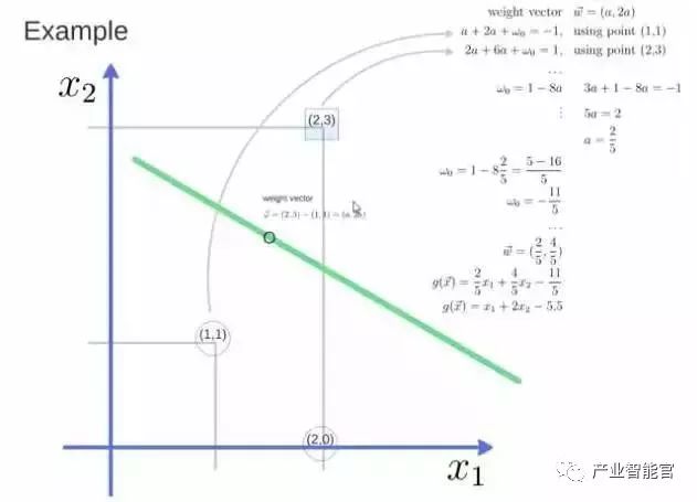 得到weight vector为(a,2a),将两个点代入方程,代入(2,3)另其值=1,代入(1,1)另其值=-1,求解出 a 和 截矩 w0 的值,进而得到超平面的表达式。