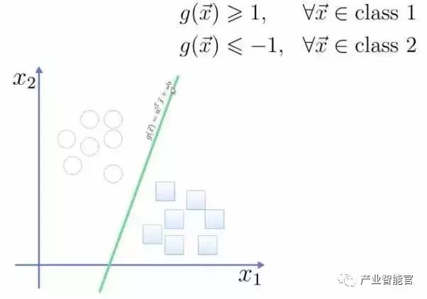 将这个超平面表示成一个线性方程,在线上方的一类,都大于等于1,另一类小于等于-1: