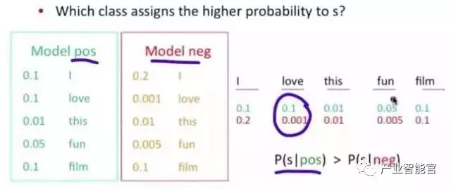 问题变成,这一类中这句话出现的概率是多少,当然,别忘了公式里的另外两个概率。例子:单词“love”在positive的情况下出现的概率是 0.1,在negative的情况下出现的概率是0.001。