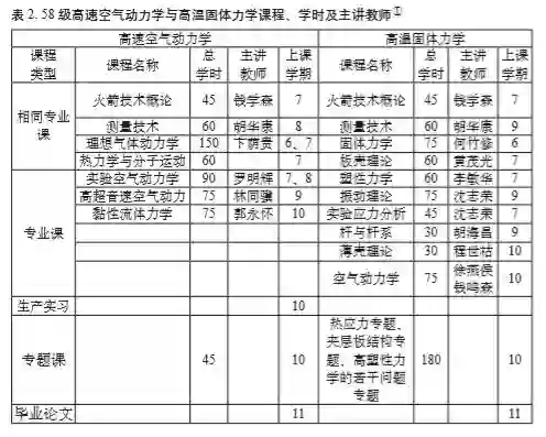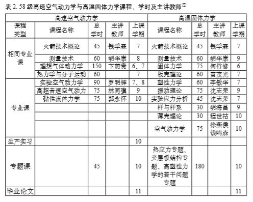 全系必修的有工程力学(含材料力学)、理论力学、火箭技术概论,再加上各个专业的特殊专业课程(总计约800学时);在当时而言,这些新专业在国内其他高校都没有开设过,因此如高速空气动力学等专业的课程设置都是实验性的尝试。
