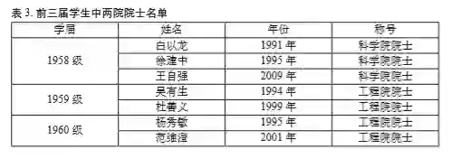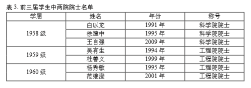 在1958—1960级力学系各专业方向的学生中,先后走出了10多名科技将军、7名中国科学院院士和中国工程院院士(表3)以及许多国内外的知名教授、学者,不负钱学森当年“上天揽月、下洋捉鳖”的期望,他们在各个领域独当一面,成绩斐然。