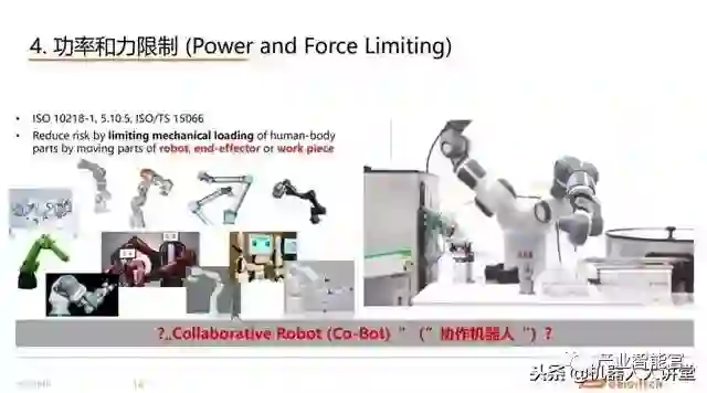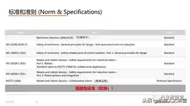 以上改进措施通过ISO 15066(Robots and robotic devices — Collaborative robots)进行规范。目前这一协议还在TS阶段,尚未成为ISO标准。