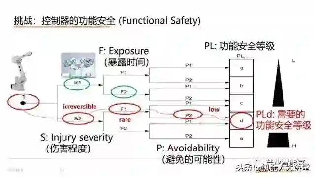 关于工业机器人协作应用,丁昊博士提到了几点挑战。第一个挑战:控制器的功能安全。关于控制器的功能安全,下面是一张风险评估图,目的是评估控制器到底应该达到何种安全标准,这主要包括三个方面:伤害程度、暴露时间、避免的可能性。