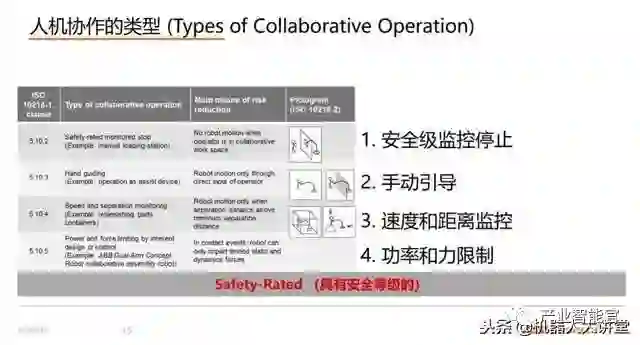 人机协作的类型包括安全级监控停止、手动引导、速度与距离监控、功率和力的限制。丁昊博士也对此分别进行了举例说明。