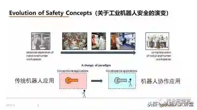关于工业机器人安全的演变,丁昊博士提到,协作或者说协同操作在国际标准里有一个非常明确的定义。而协作其实是应用。协作不仅仅只是针对机器人的本体,研究人员还需要考虑到机器人的传感器、夹具等。在做人机协作和风险评估的时候不仅要考虑到本体的问题,还要考虑其他一些问题比如:人的位置、人机是碰触式的还是传感器能够感知人的位置、或是用力、机器人本身是否有锋利的夹具可能对人造成伤害。而触碰又包括碰触到人的身体、上半身、下半身。所以,协作的定义是应用,而不仅仅是本体本身。