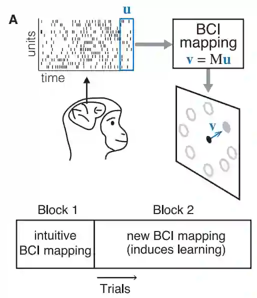 猴子通过调节初级运动皮层中记录的 90 个神经元的尖峰活动,将计算机光标引导到八个视觉目标之一。神经活动与光标速度之间的关系由 BCI 映射定义。当引入新的 BCI 映射时,受试者必须学会修改他们的神经活动以提高性能(即,将光标引导到目标)。
