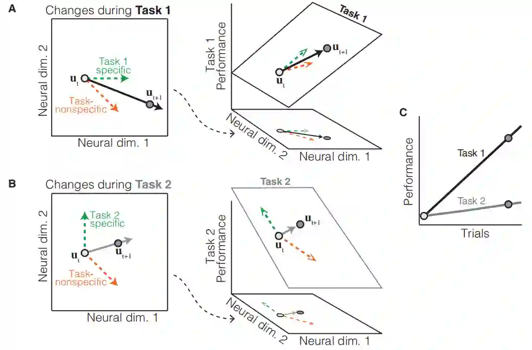 为什么大脑会表现出如此大的非特定任务变化?回答这个问题可能会帮助我们建立更好的生物学习模型,同时也会激发人工学习的新方法。在执行任何给定任务时,大脑还必须管理一系列与任务执行没有直接关系的过程,例如唤醒、注意力和记忆。这些过程可能有自己的目标,虽然与它们所支持的任何过程相关,但与执行任务本身无关,因此会推动种群活动中与任务无关的变化。