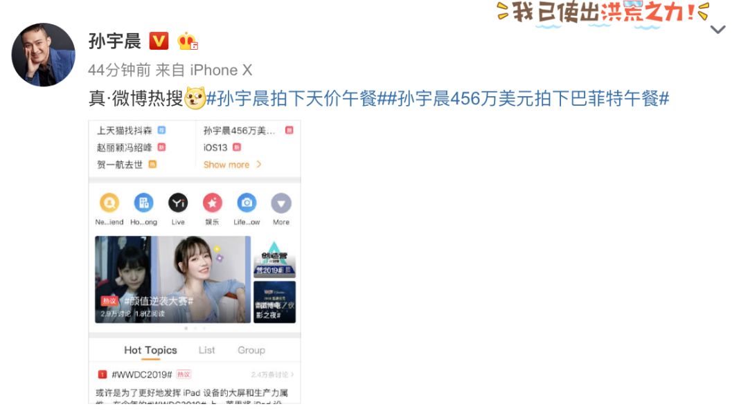 6月4日凌晨四时许,孙宇晨转发报道称,巴菲特表示十分期待与孙宇晨和他的朋友们共同会面。其次,在6月4日的微博宣传中,孙宇晨给其微博加上#孙宇晨拍下天价午餐##孙宇晨456万美元拍下#等话题标签。