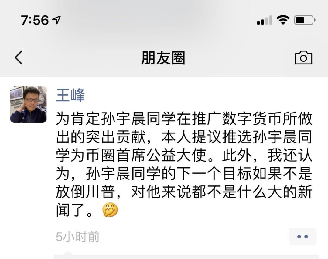 火星财经创始人王峰4日凌晨在其朋友圈“提议推选封孙宇晨为币圈首席公益大师”,其间深意不言而喻。
