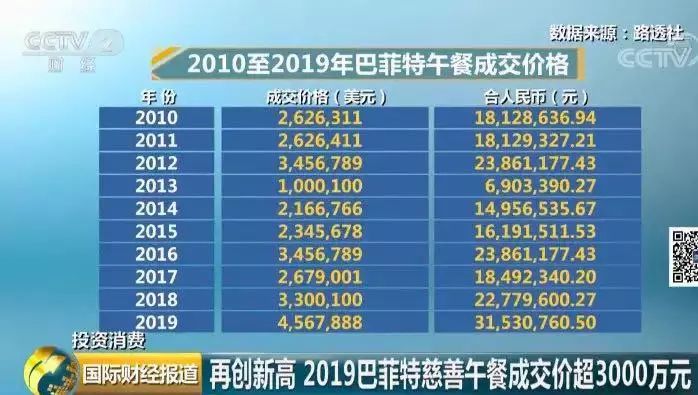 早期拍卖价格相对“亲民”,2001年,两个中标者只花了1.86万美元就获得了与巴菲特共进午餐的机会。但是随着拍卖在ebay上举行,价格不断走高,并在2012年和2016以345.6789万美元达到顶峰。