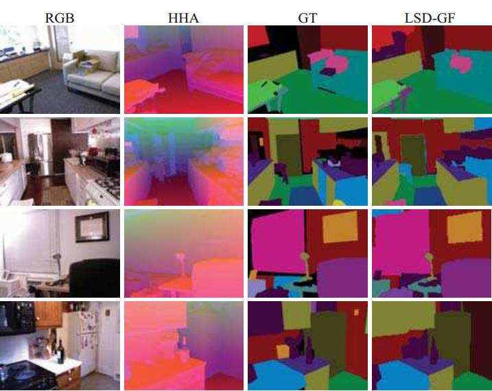 从左至右依次是彩色图,HHA图,Ground Truth和网络的预测结果