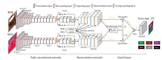 为了解决这两个问题,我们第一个提出了局部感知的反卷积神经网络(LS-DeconvNet)。LS-DeconvNet使用RGB-D数据,在每一个反卷积层结合了局部视觉信息和几何信息。我们的做法使网络不仅能够有更大的感受域,同时也可以恢复出更加精细的物体边缘。对于RGB-D数据的融合,我们引入了一个门式融合的层来有效的结合两个LS-DeconvNets。这一层可以学习RGB和Depth数据在每一个像素上的融合权值。