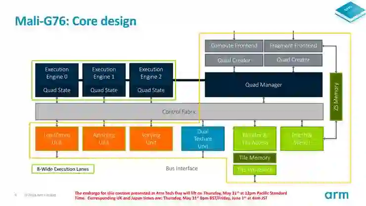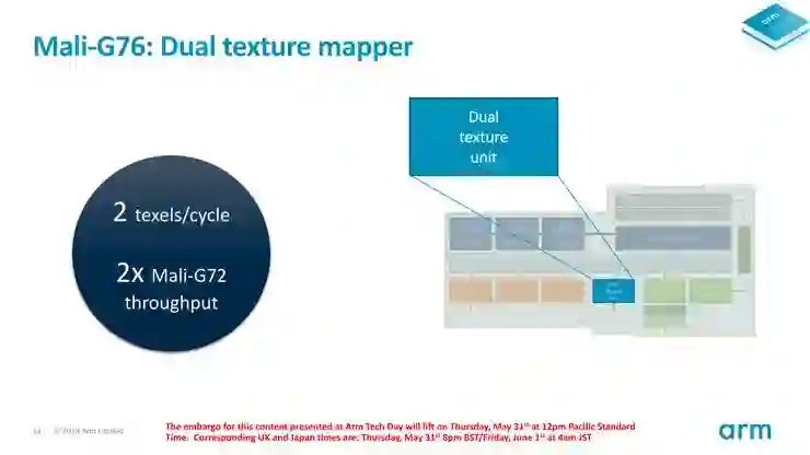 在像素和纹理方面,Mali G76也使用了双单元方案,每周期可以处理两个像素或两个纹理,ALU与像素和纹理单元的比例与之前保持一致。