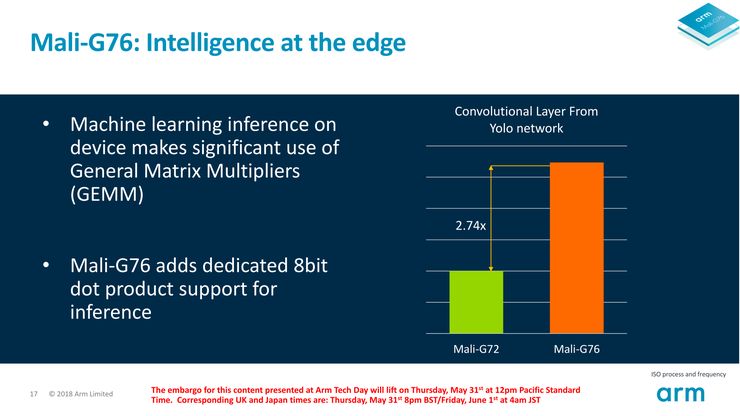 虽然Arm大幅强化了Bifrost架构的图形渲染性能,但这不是Mali G76核心的唯一改变,机器学习性能的提升也是此次的重头戏。