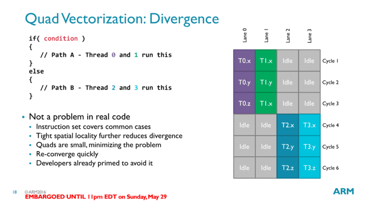 Arm在推出Bifrost架构时表示,他们采用了4宽度线程粒度,以减少因线程发散所造成的ALU(算术逻辑单元)闲置。这从理论上看是一种很好的策略,如果运算中有大量分支代码,那么因线程发散而闲置的ALU就没有了任何价值。