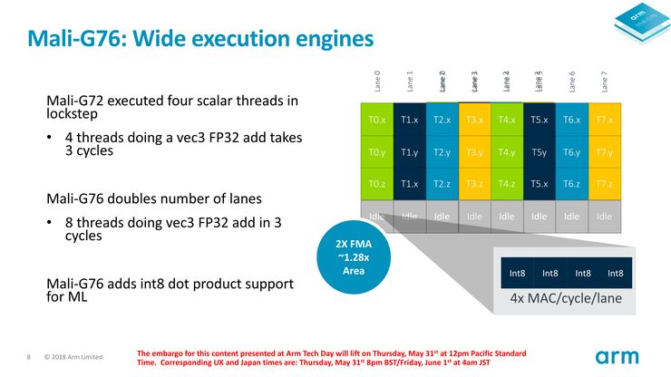 Arm为Mali G76的ALU强化了int8格式的支持,这一数据格式是处理神经网络的关键操作,在机器学习推理非常重要,尽管8位整数的精度有限,但在很多情况下仍然足以进行基本推理。