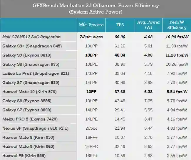 三星Exynos 9810和8895虽然GPU面积很大,但由于频率只有560MHz左右,因此功耗表现尚可。而麒麟970的Mali G72 MP12为746MHz,功耗上升非常明显,能耗比仅略高于使用Mali G71的Exynos 8895。麒麟960的Mali G71 MP8频率甚至高达1037MHz,暴增的功耗使其能耗比还不如老旧Exynos 7420上的Mali T760 MP8。
