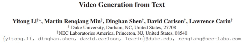 用写好的剧本(文字)自动生成电影或许是很多剧作家的梦想,人工智能技术最近让这一梦想距离现实更近了一步。杜克大学 Yitong Li 等人提出了一种结合变分自编码器(VAE)与生成对抗网络(GAN)的算法,可为一小段文本生成相应短视频,该研究已在 AAAI 2018 大会上进行了展示。
